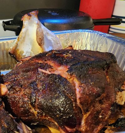 *Add more Butt Rub and pour some of the drained separated pan juices over the butt